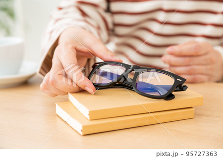 眼鏡を手にして本を読むカジュアル姿のミドル女性