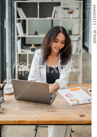 Attentive businesswoman working at her laptop, with documents spread out on a wooden desk in a trendy office setting.