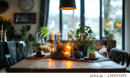 Stylish family dining table with candles and plants..