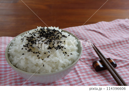 テーブルの上の茶碗に盛られた黒ごまご飯