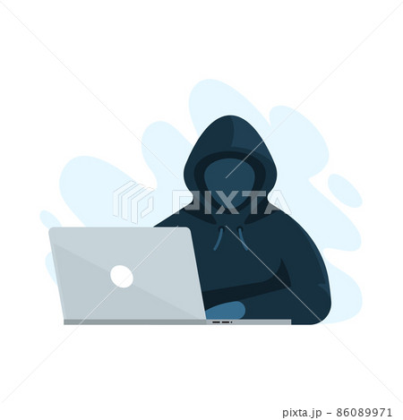 Hacker using a laptop icon, criminal man in a hoodie breaking into computer's security