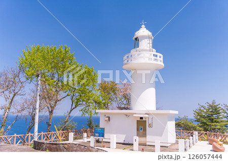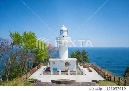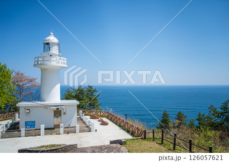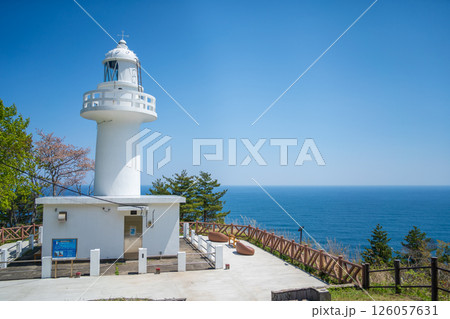 「岩手県」青空と新緑に映える白亜の黒崎灯台 岩手県
