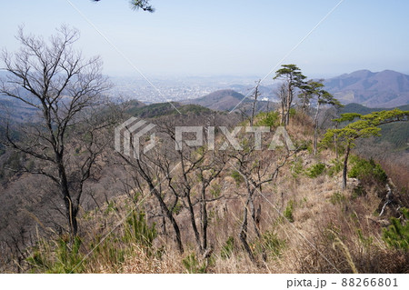 桐生市菱町から仙人ケ岳登山コースを登る。黒川左岸の尾根の仙人ケ岳登山道から西、桐生市街地方面