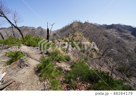 桐生市菱町から仙人ケ岳登山コースを登る。黒川左岸の尾根の仙人ケ岳登山道 2014年の林野火災の跡