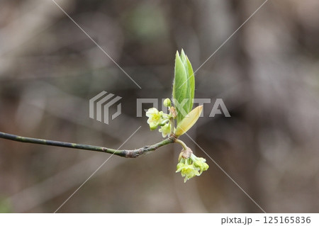 春の素材・爪楊枝で名高いクロモジの可愛い花蕾・横位置