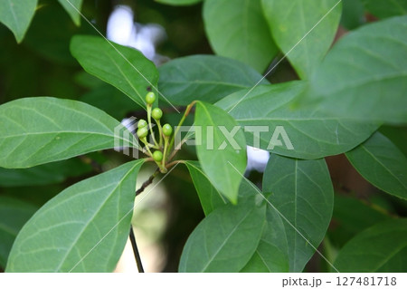 自然 植物 クロモジ、雌花花序です。葉腋に突き出した柄の先に花序がつきます