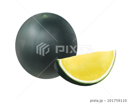 黄色で種なし黒玉スイカ(丸ごととカットしたもの)のリアルな水彩調イラスト