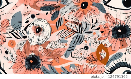 Whimsical Floral and Eye Pattern, Playful and Surreal, Decorative Textile Design, Seamless Pattern