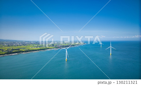 夏間近梅雨の合間の富山県入善町風力発電施設と富山湾