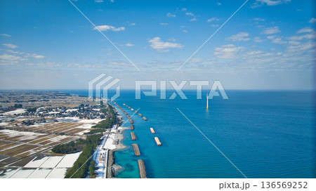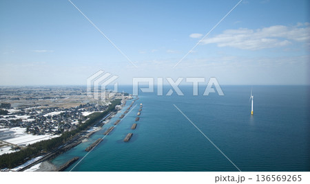 8月の終わり富山県下新川海岸の洋上風力発電風車や黒部川扇状地の様子