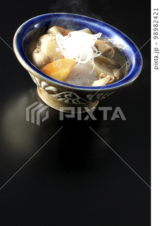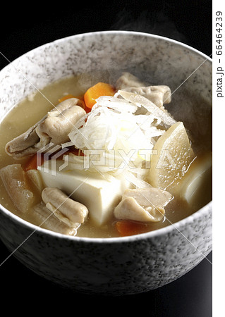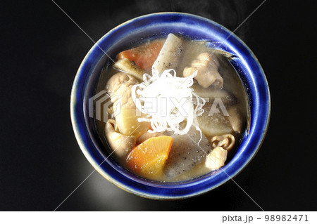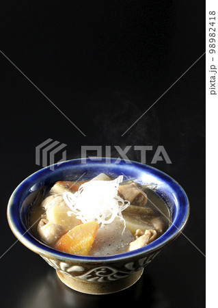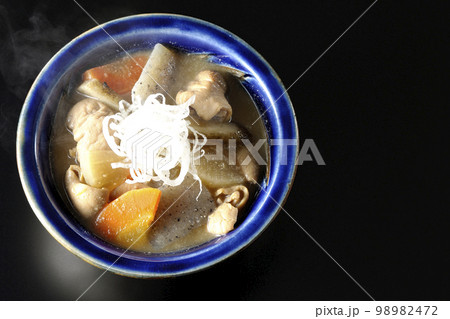 人参、蒟蒻、牛蒡、大根の入った熱々豚もつ煮込みを黒背景で撮影