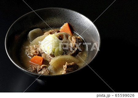 人参、蒟蒻、牛蒡、大根の入った豚のもつ煮込みを黒背景で撮影
