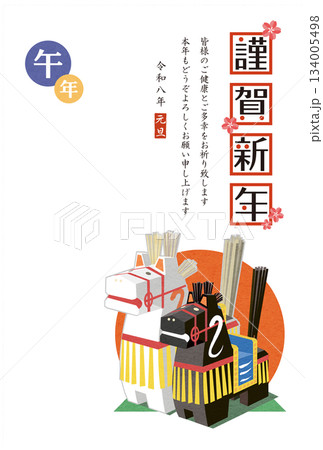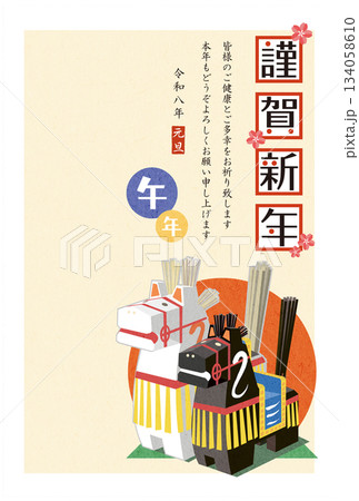 年賀状 縁起の良い馬の郷土人形「三春駒」 イラスト 葉書用テンプレート