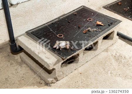 軒下通気口の前に仕掛けられたネズミ捕獲用粘着シートに掛かった、捕獲されたばかりのネズミの子供