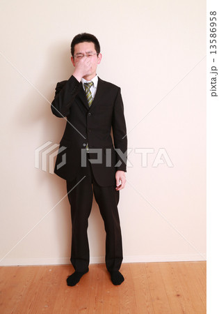 ティシュで鼻水を拭くYシャツ姿の男性会社員