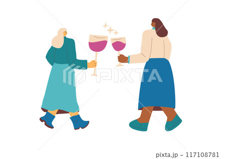 Anniversary celebration. Female friends meeting with beverage. Wine tasting event. Cute characters couple with wineglasses. Vector hand drawn illustration isolated on white background.