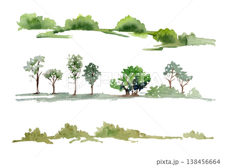 Rows of deciduous trees, low shrubs or bushes, lush foliage plants. Landscape isolated elements hand drawn in watercolor. Travel souvenirs design, farm tourism marketing, natural cosmetics visuals