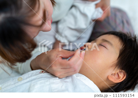 子供の鼻掃除をする母親