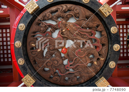 龍の彫刻の背景素材・浅草雷門に下げられた提灯下部に掘られた龍・横位置