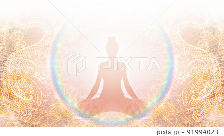 虹の輪と双龍の背景でヨガ瞑想をする女性のイラスト素材