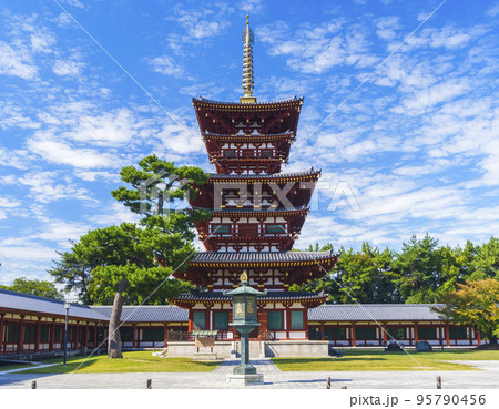 青空に映える薬師寺の東塔と灯籠(奈良県奈良市西ノ京町)