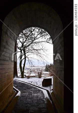 国の有形文化財の龍洞院架道橋トンネル内から千曲市街を望む