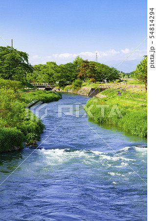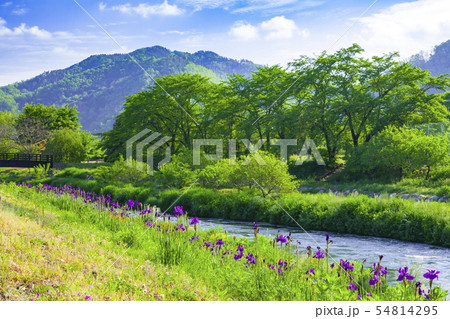 川岸に咲くアヤメと新緑の風景、長野県安曇野市龍門渕公園にて