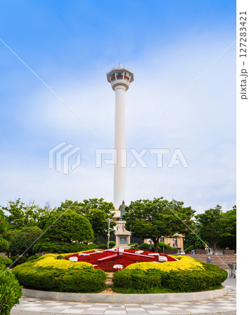 韓国 釜山タワー(ダイヤモンドタワー)と花時計 夕景