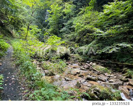 奥の滝へ続く生い茂った遊歩道。広島県安芸太田にある龍頭峡。