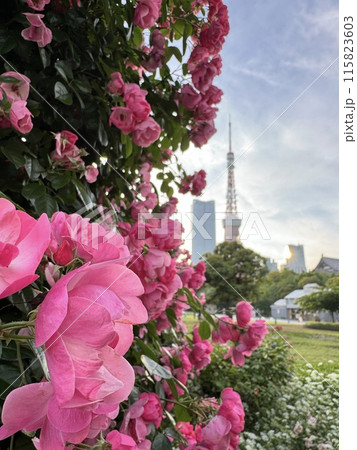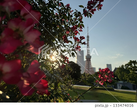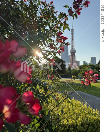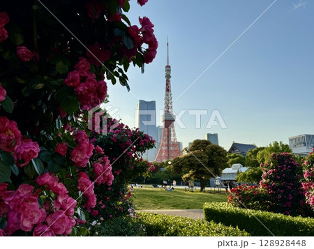 芝公園に咲くピンク色のバラ越しに見える東京タワー