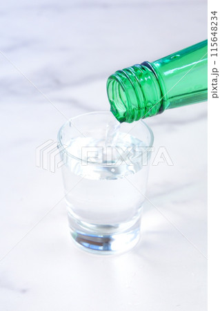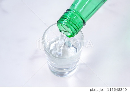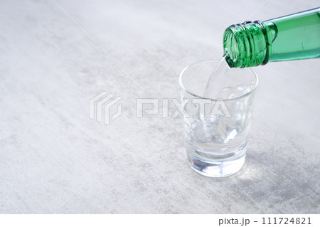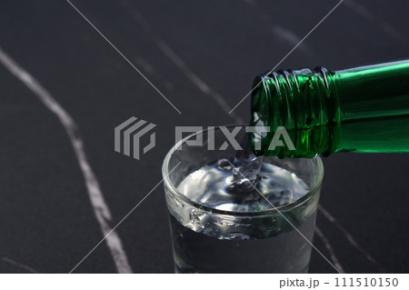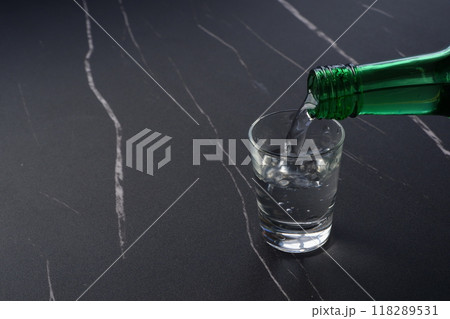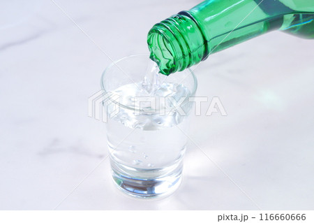 韓国焼酎(ソジュ) - 韓国の伝統的な蒸留酒、よく冷えた韓国焼酎(ソジュ)をグラスに注ぐ