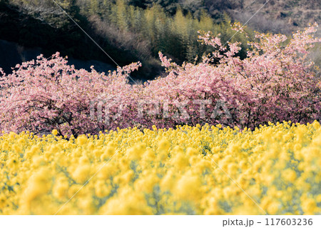 春の公園風景 菜の花と河津桜