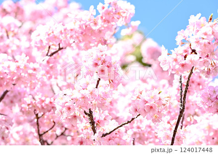 青空の下、ソメイヨシノの桜の花の満開の風景。