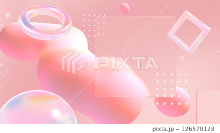 ガラスや流体が浮かぶグラスモーフィズム風の立体空間 - ピンク