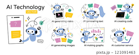 Set of vector illustrations of AI technology. Cute robots performing tasks, generating video, creating text, and offering customer service. Artificial intelligence doodle icons. Flat cartoon design
