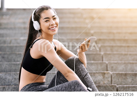 Cheerful Asian Woman Listening Music On Smartphone, Relaxing After Fitness Workout In Park, Sitting On Concrete Steps Outdoors, Empty Space