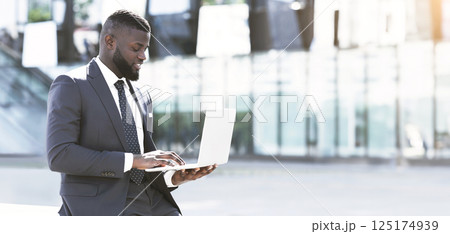 Successful Afro Entrepreneur Working On Laptop During Coffee Break In City. Empty Space
