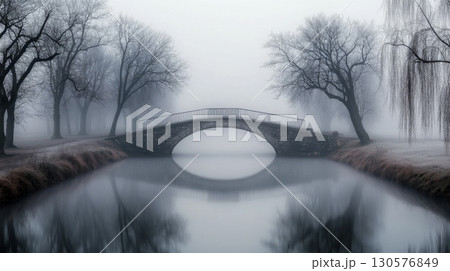 In the early morning fog, a tranquil stone bridge gracefully arches over a still river, surrounded by bare trees. The atmosphere is peaceful, evoking a sense of calm and solitude.