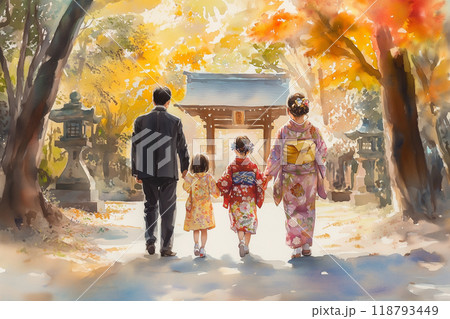 七五三の風景:着物姿の家族と神社での温かなひととき