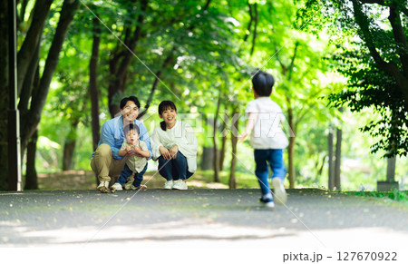 【相模原市立麻溝公園の芝生広場で遊ぶ1歳児 しゃがむ】