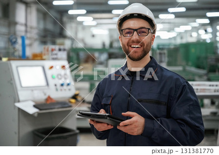 Cheerful engineer with photovoltaic solar panels outdoors at daytime
