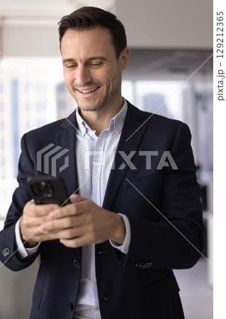 Handsome person with smartphone. Man with blue electric car on the charge station