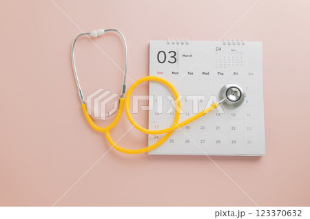 Doctor Day design with calendar and yellow stethoscope on pink. A theme promoting annual checkups