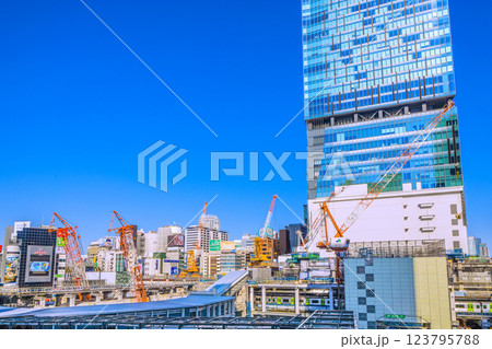 日本の東京都市景観6基のクレーン…(支柱切断)。さよなら渋谷駅西口、左奥旧ハチ公改札。右奥は六本木等