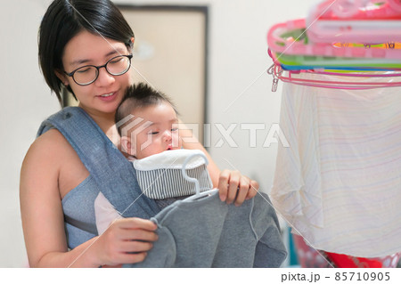 Asian woman is drying clothes on the clothesline after washing with baby daugther in baby carriers.