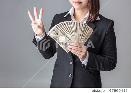 スーツの女性が笑顔で何十万のお金を持ち片手で3のポーズをしている