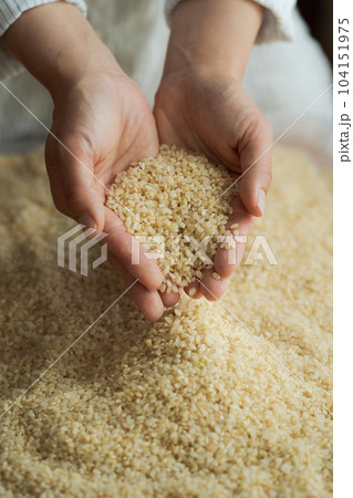 スプーンに載せた発芽玄米(生米)のクローズアップ