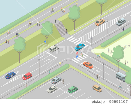 アイソメトリック図法で描いたT字交差点のイメージ[B](緑地)+歩行者