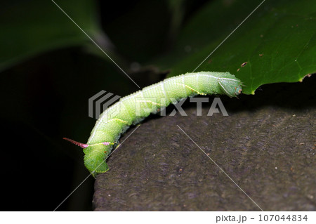 若草色の大型の芋虫、スズメガ科の幼虫が人工丸太の先で伸びる(マクロレンズ使用・自然光・接写写真)