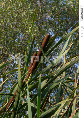 Lesser bulrush with brown flower spikes growing in wetland area during sunny day near a lake surrounded by green vegetation